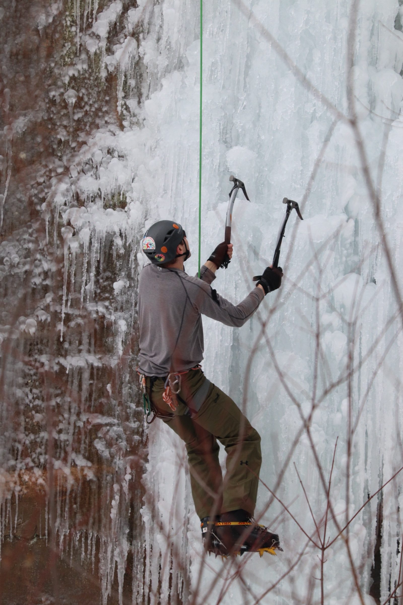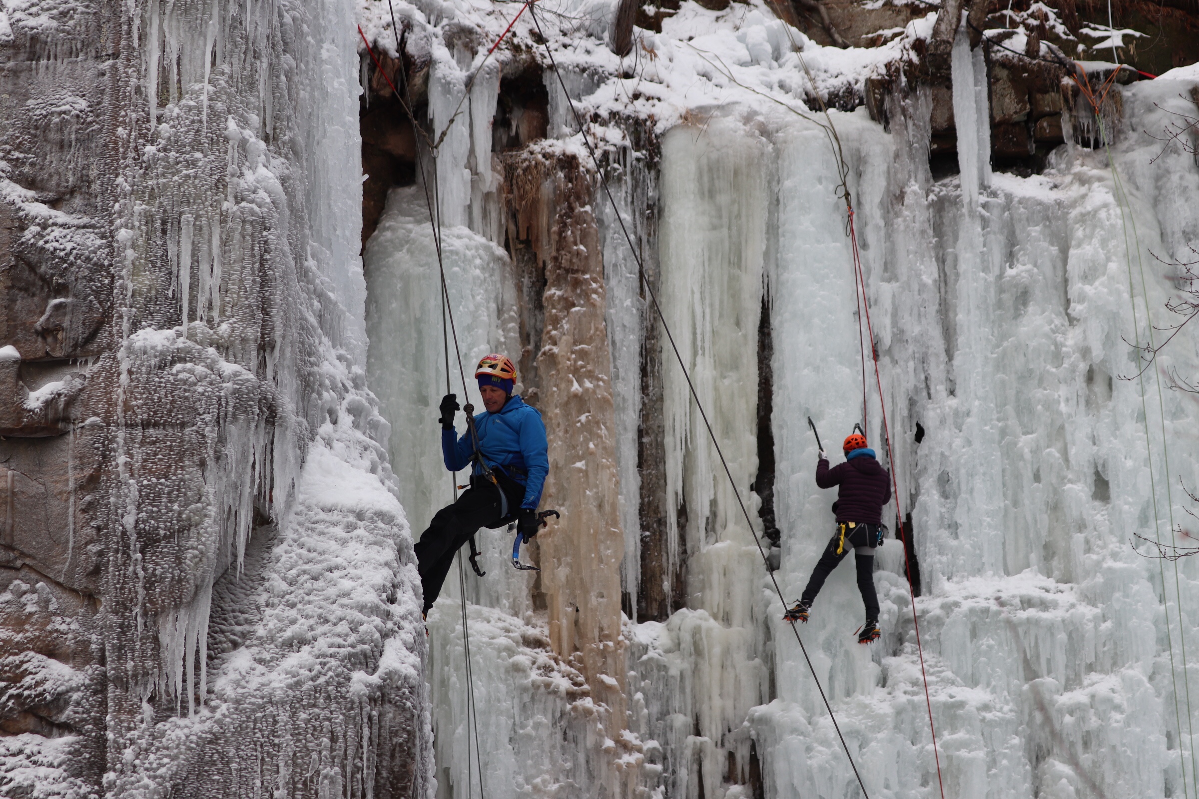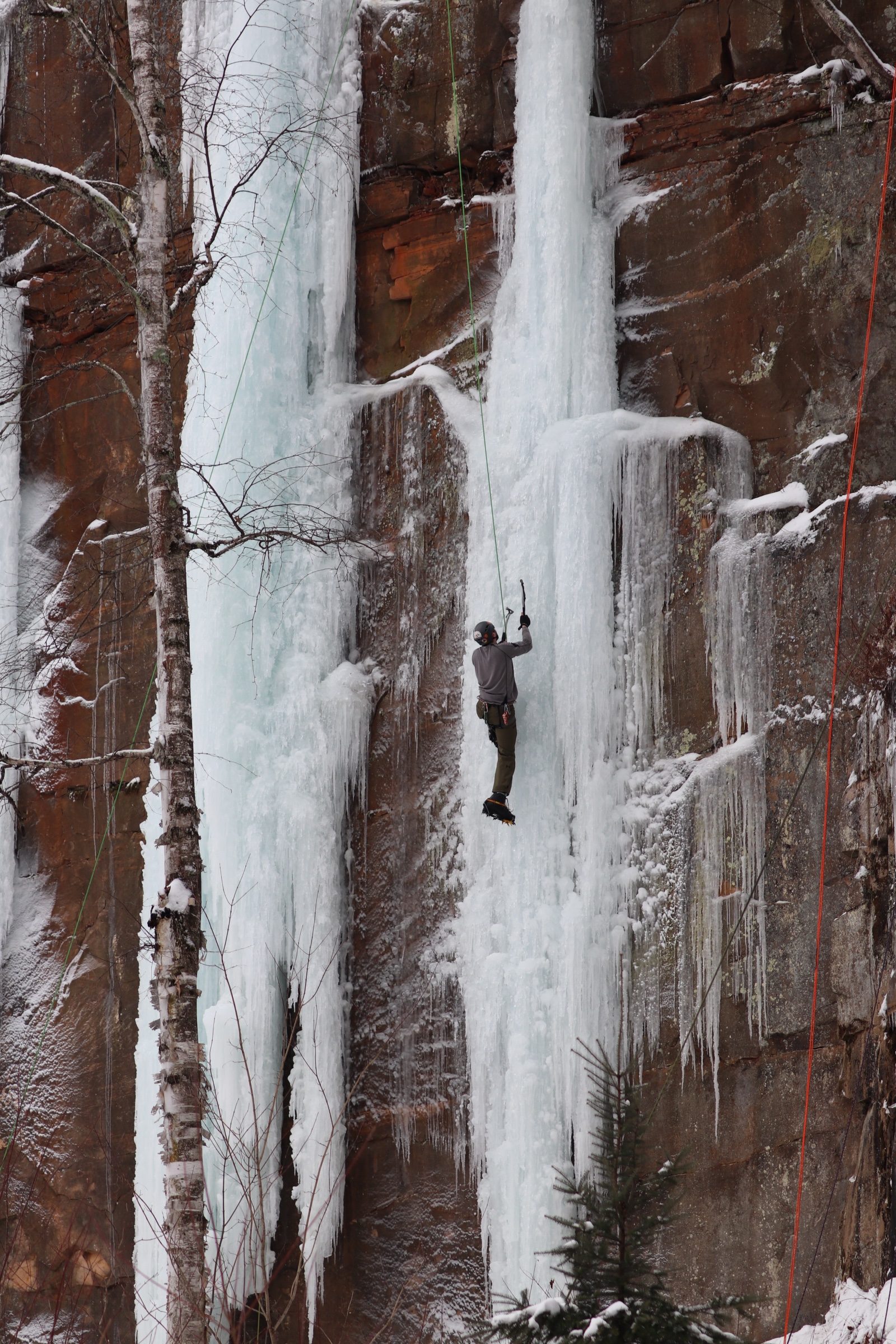 Ice climbing is when you ascend ice formations like that of the frozen falls at Robinson Quarry Ice Park in Sandstone.